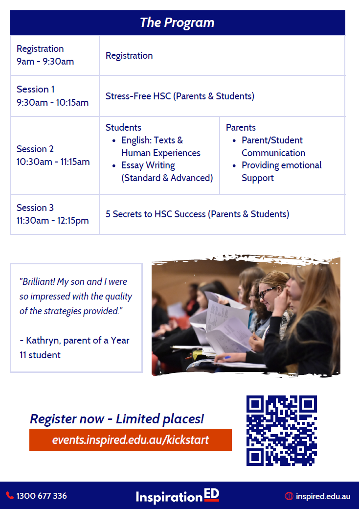 At our November Kickstart Seminars, your family gets a morning with senior HSC markers and counsellors who cut through the clutter and show what actually lifts marks and motivation.
