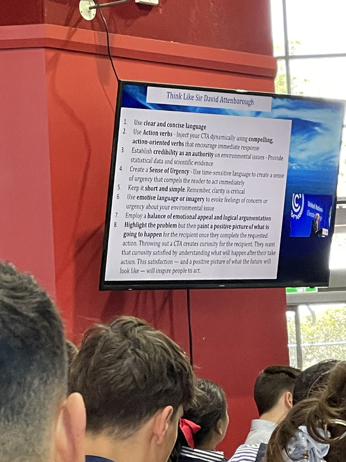 After lunch, we worked with our table groups to develop emails to corporates and governments about doing more due to the effects of climate change.
